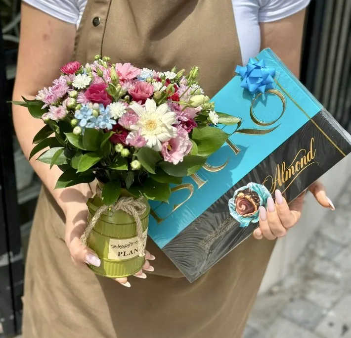 זר חופשי עונתי בתוך הכד עם מארז שוקולד איכותי
